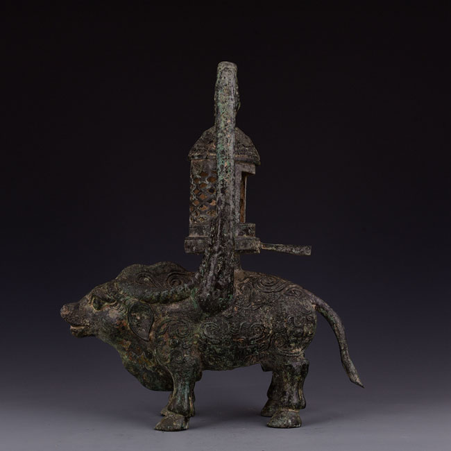 湖南省博物館的西漢牛形燈,燈為牛形,兩角沿背的兩側(cè)以圓管狀向上豎立,并會(huì)合為一,向下擴(kuò)大為覆碗狀,作為出煙管。牛腹中空可盛水,點(diǎn)燃時(shí)煙可通過腹中,以保持室內(nèi)空氣清潔,側(cè)有銘文十字,為當(dāng)時(shí)長(zhǎng)沙王劉發(fā)或其后代宗廟用器。